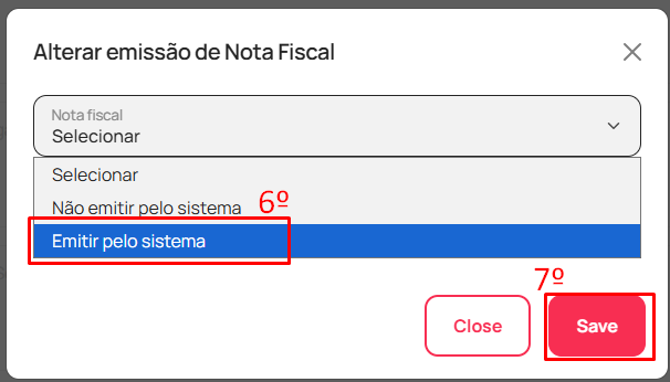 - Em seguida, no campo "Nota Fiscal" selecione a opção "Emitir pelo Sistema" (6) e clique em "Salvar" (7)