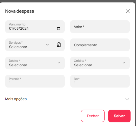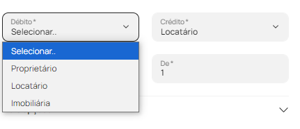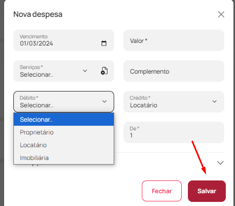 - Escolha o serviço, insira o valor e informe o crédito ao LOCATÁRIO (6). Em seguida, clique em "Salvar" (7)