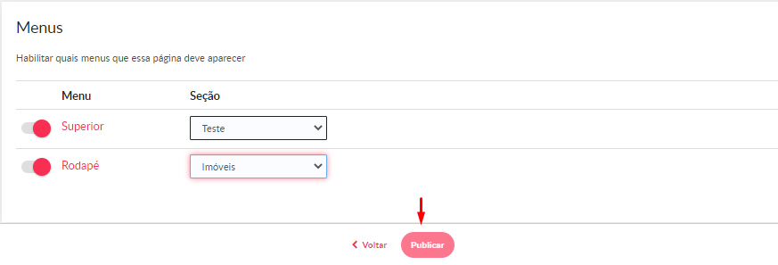 6 - E para finalizar, escolha em qual menu ficará essa página (Parte superior ou rodapé do site) e clique em "Salvar".