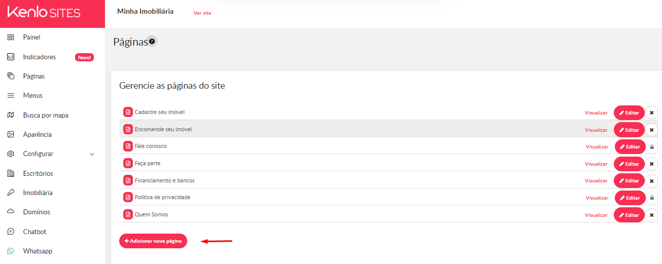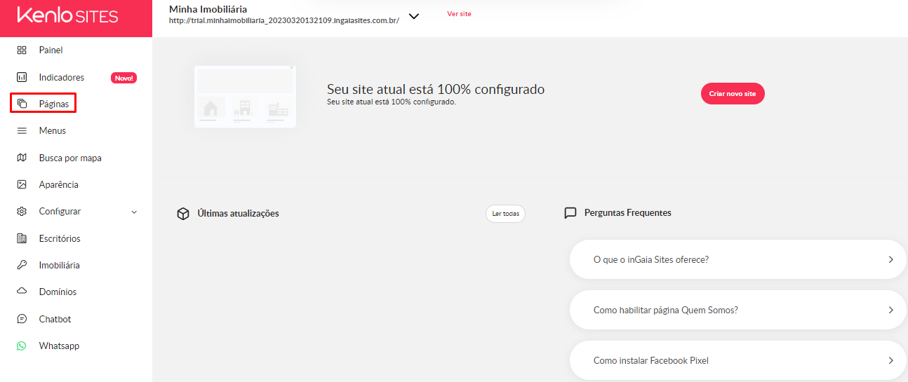 2 - Na tela de configuração do site clique em "Páginas"