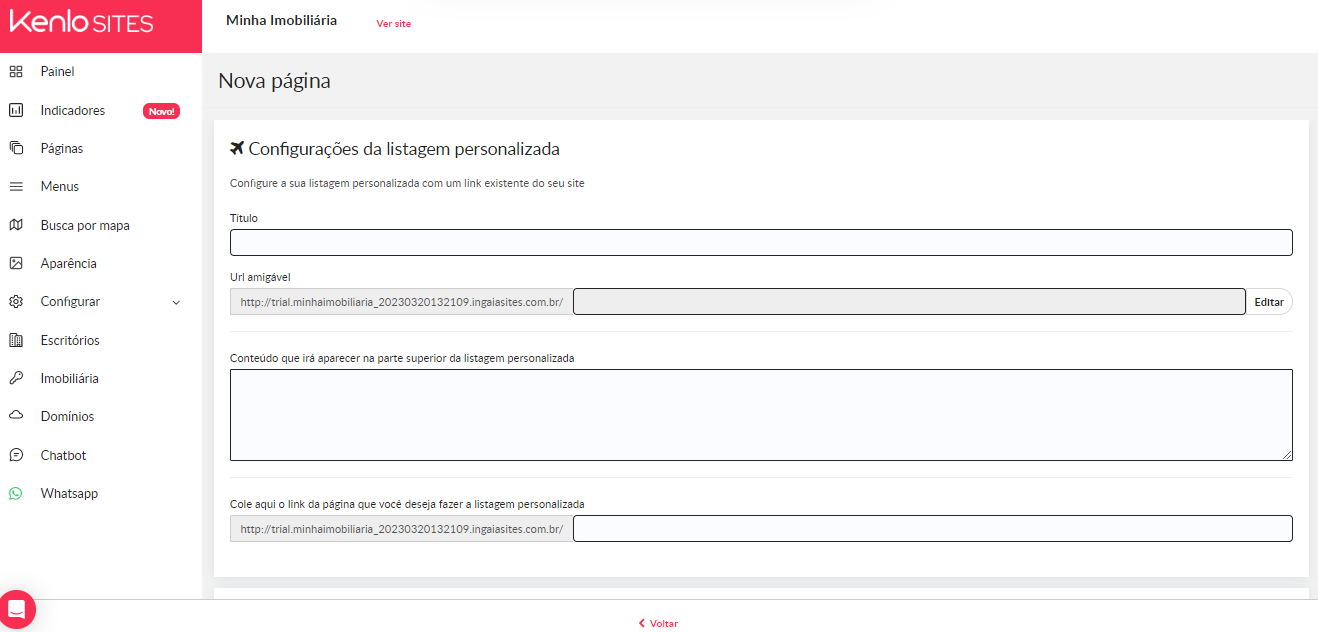 5 - Nas configurações da listagem personalizada você poderá configurar o título da página, a URL amigável, uma breve descrição que aparecerá na parte superior da listagem, a URL da página que será apresentada.