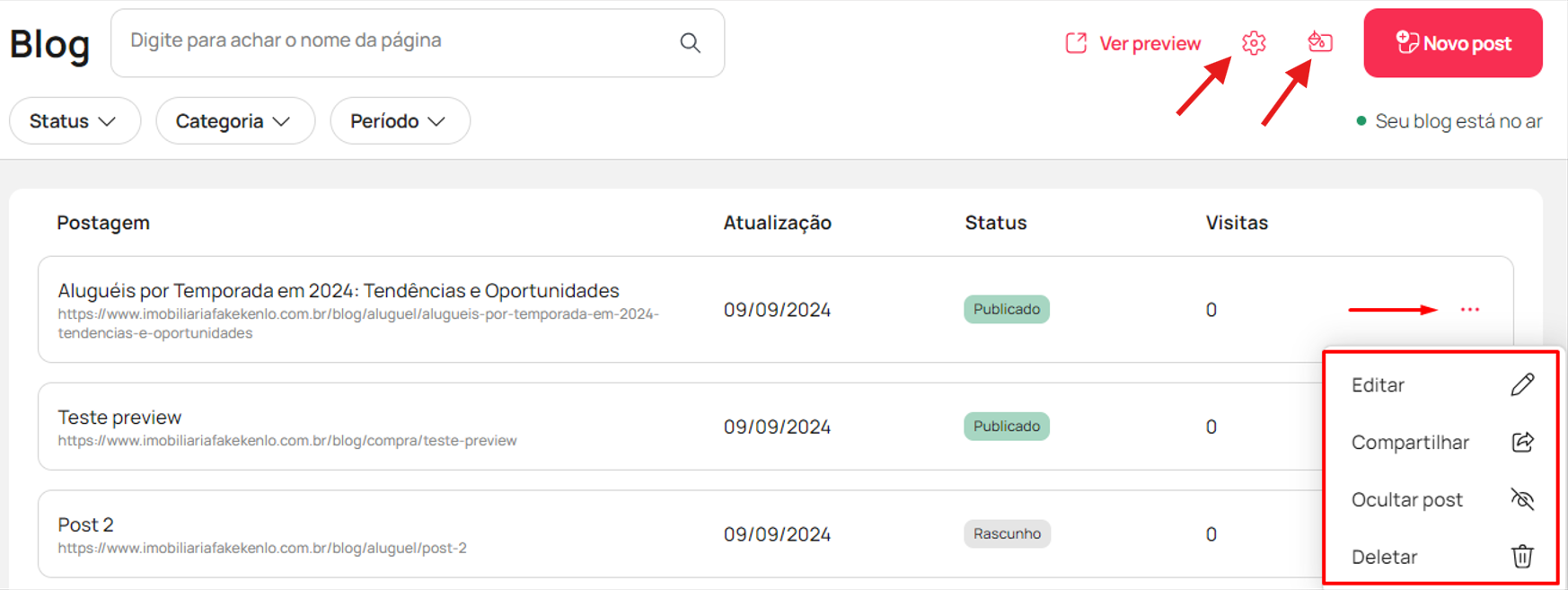 - O post será adicionado à lista de postagens, onde você poderá editá-lo, compartilhá-lo, ocultá-lo ou excluí-lo a qualquer momento.