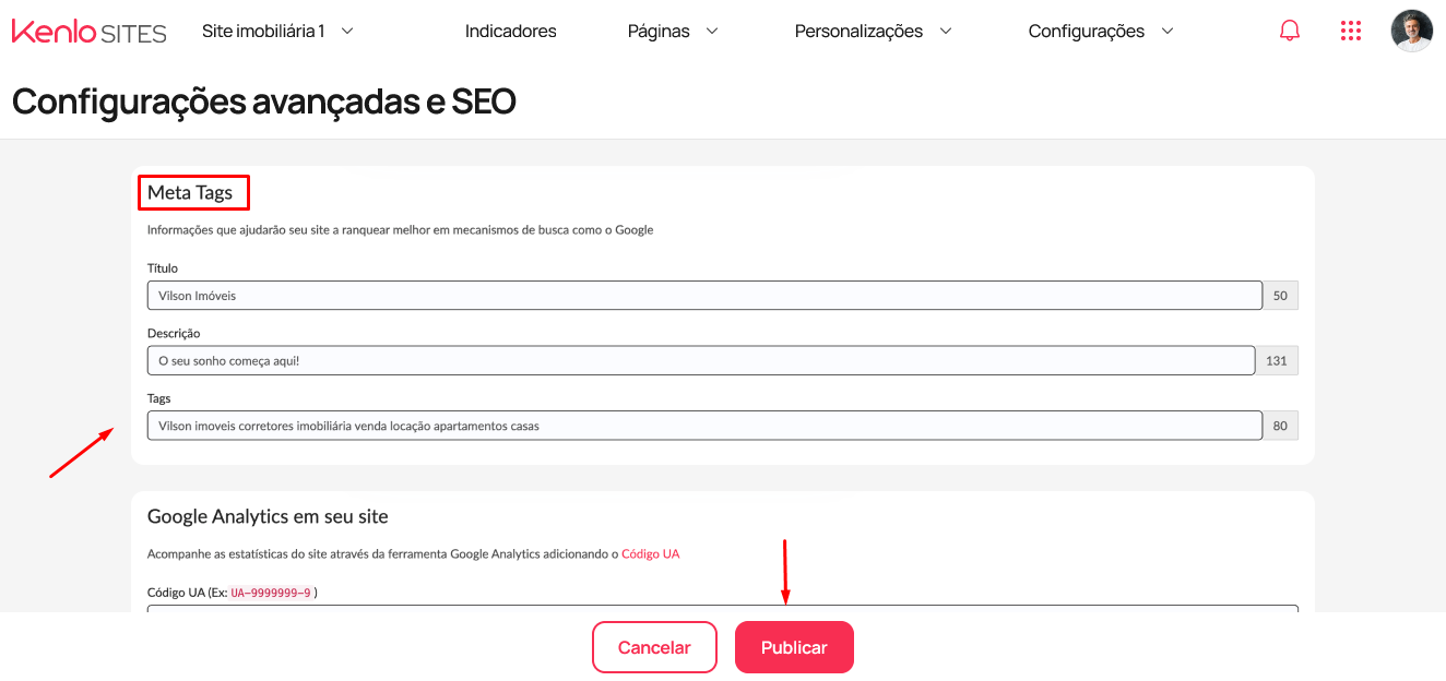 4 - Após configurar clique em "Publicar para salvar as informações.