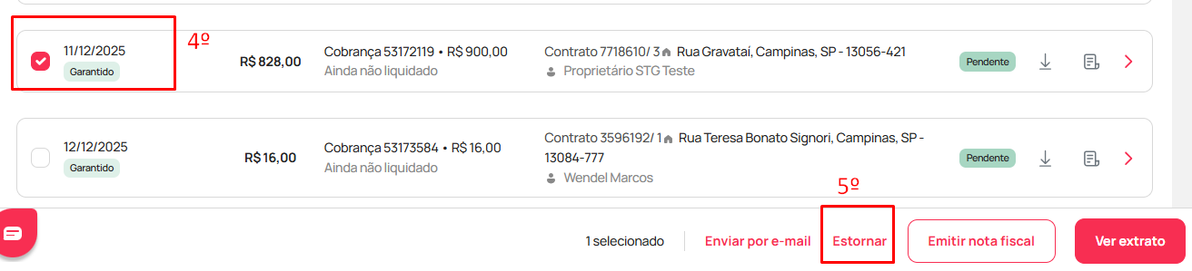 - Localize o repasse que deseja desfazer, selecione(4) e clique em "estornar (5)"