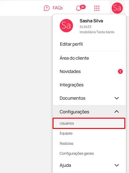 No sistema, com o perfil de Diretor ou Supervisor, acesse as iniciais do seu usuário ao lado direito da tela e clique em 'Configurações' > 'Usuários'.