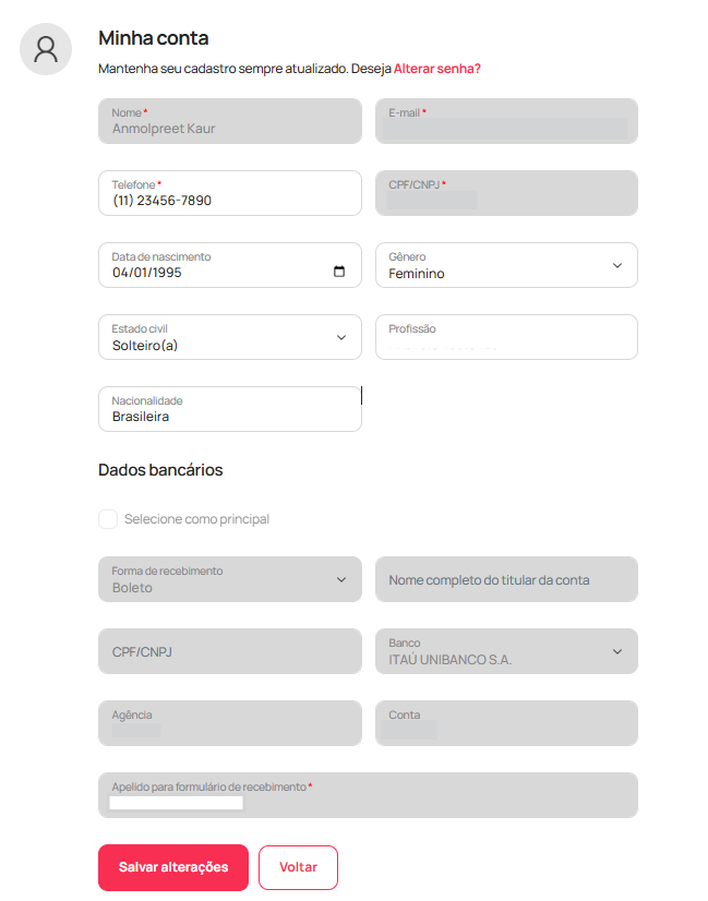 No menu "Minha conta", o proprietário poderá consultar e, em alguns casos, editar seus dados: