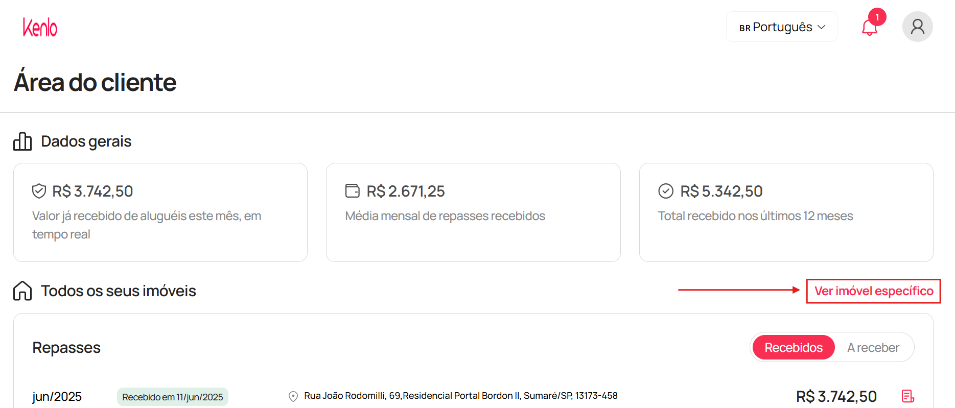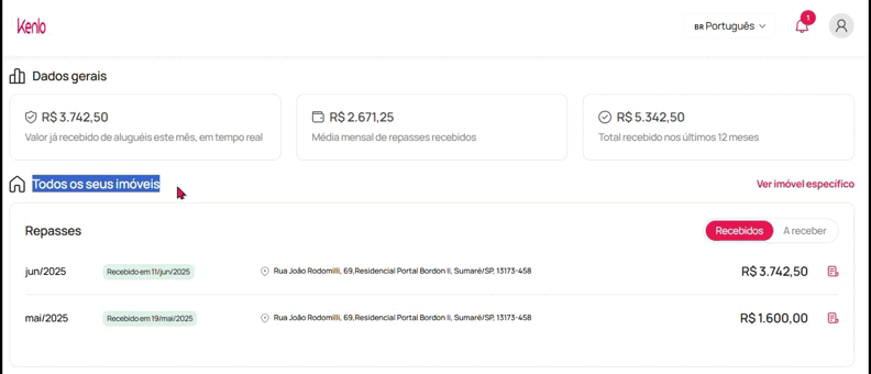 Na tela principal, o proprietário irá visualizar o resumo dos imóveis sob sua administração, valor recebido no mês atual, média mensal de repasses e total recebido nos últimos 12 meses.