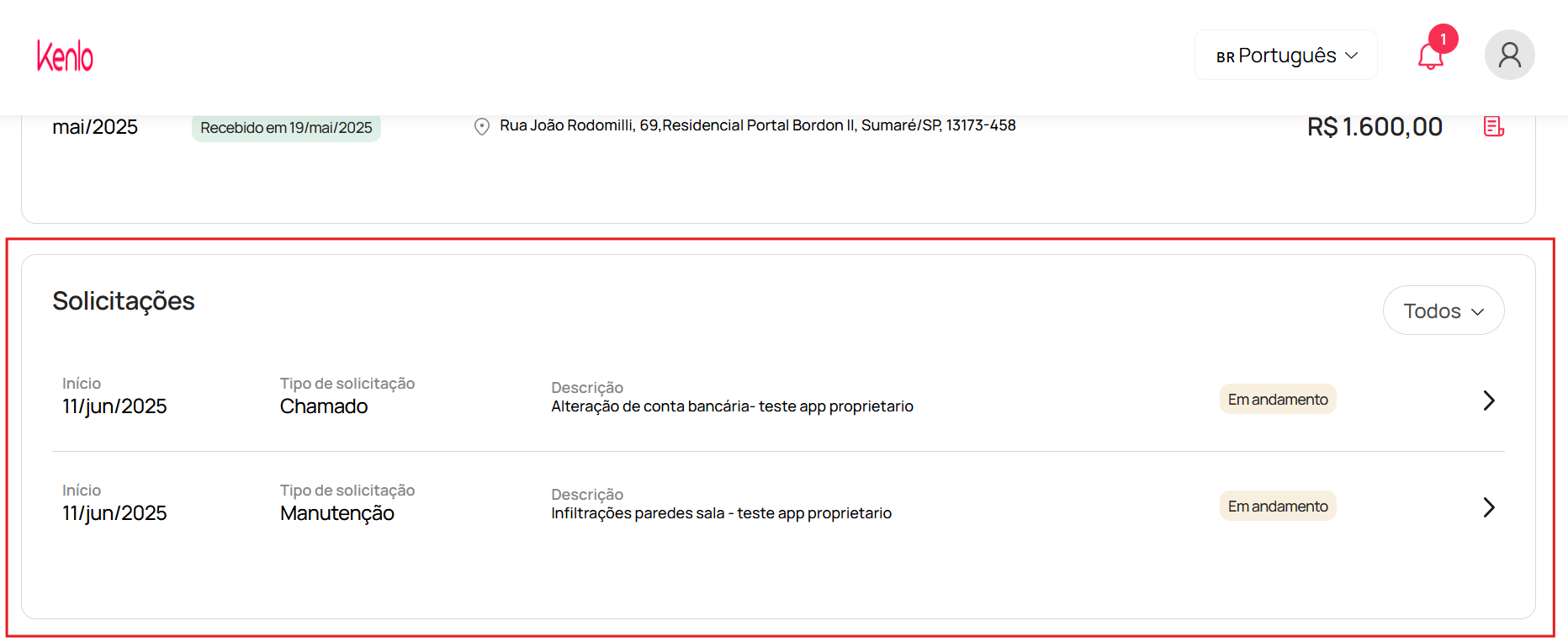 O proprietário visualiza todas as solicitações em andamento com a imobiliária, sejam elas relacionadas a manutenção, dúvidas ou benfeitorias