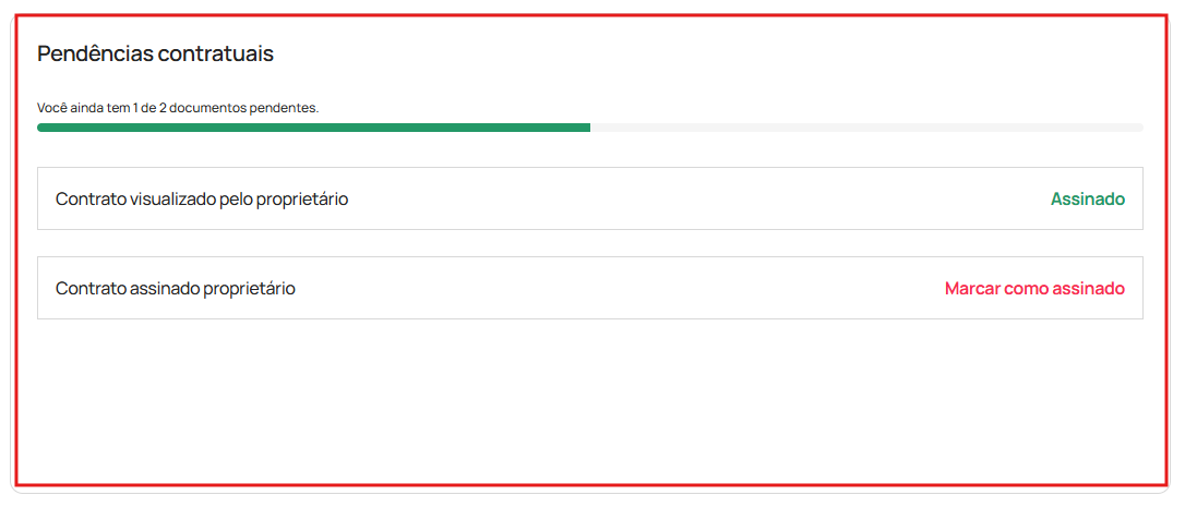 Ao clicar em “Marcar como assinado”, o proprietário comunica à imobiliária que uma pendência contratual foi resolvida.
