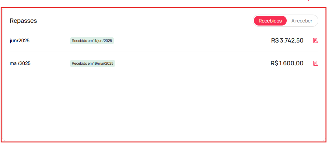 Voltando a tela principal, logo abaixo dos dados principais, está o quadro com a lista de repasses recebidos e a receber.