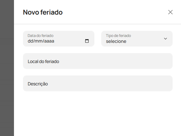 Informe a data, o tipo de feriado, local e descrição (exemplo: “Natal”, “Carnaval”).