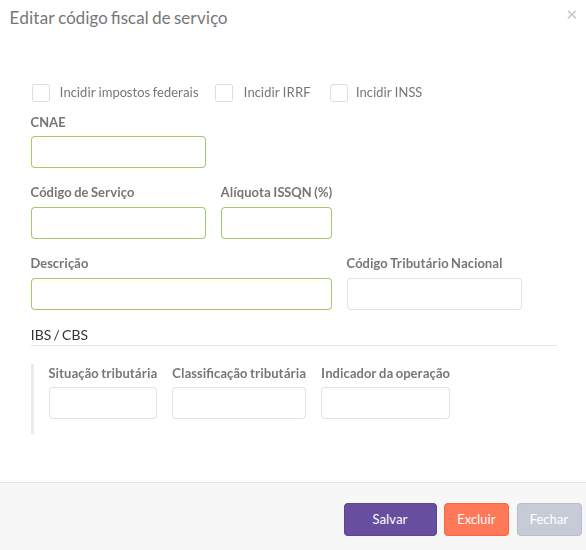 - Na tela Editar código fiscal de serviço, localize o novo campo e a nova aba IBS/CBS, que contém quatro novos campos a serem configurados: