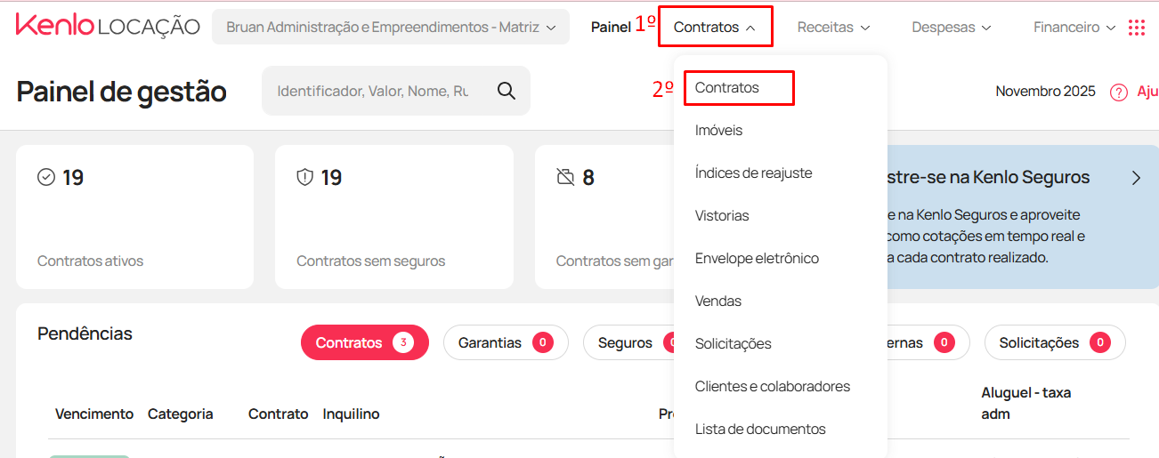 Dentro da tela inicial do sistema clique em Contratos (1) > Contratos (2)