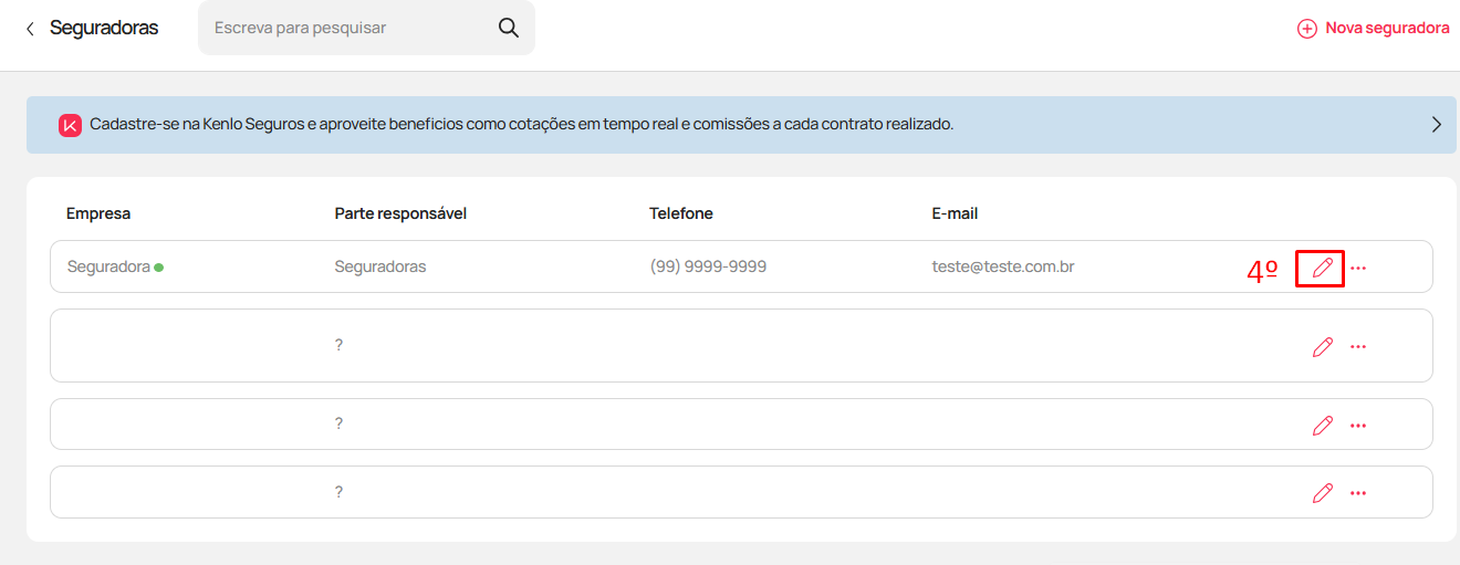 Na lista apresentada encontre a seguradora que precisa ser alterada e clique no ícone "lápis (4)"