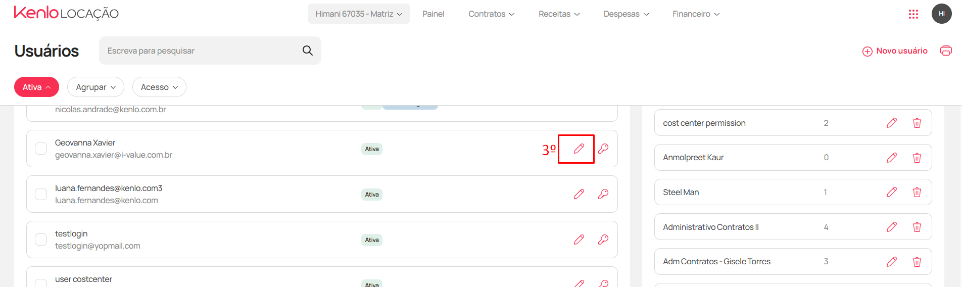 - Na tela de usuários, ao lado esquerdo, busque na lista o usuário que deseja alterar informações e clique no ícone de "Lápis" (3)