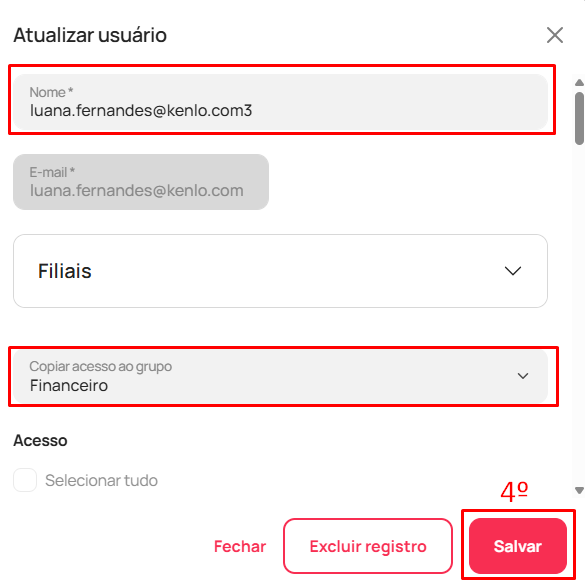 - É possível alterar apenas o nome do usuário e o grupo de permissões que ele terá no sistema. Após alterar, clique em "Salvar" (4)