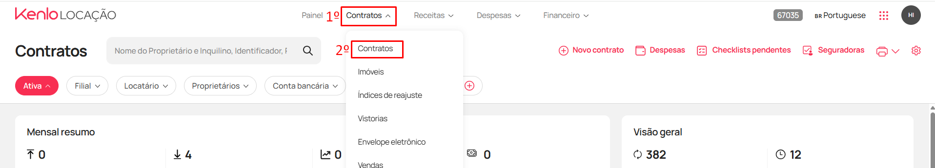 - Na parte superior da tela, localize e clique no menu "Contratos" (1) > "Contratos" (2)