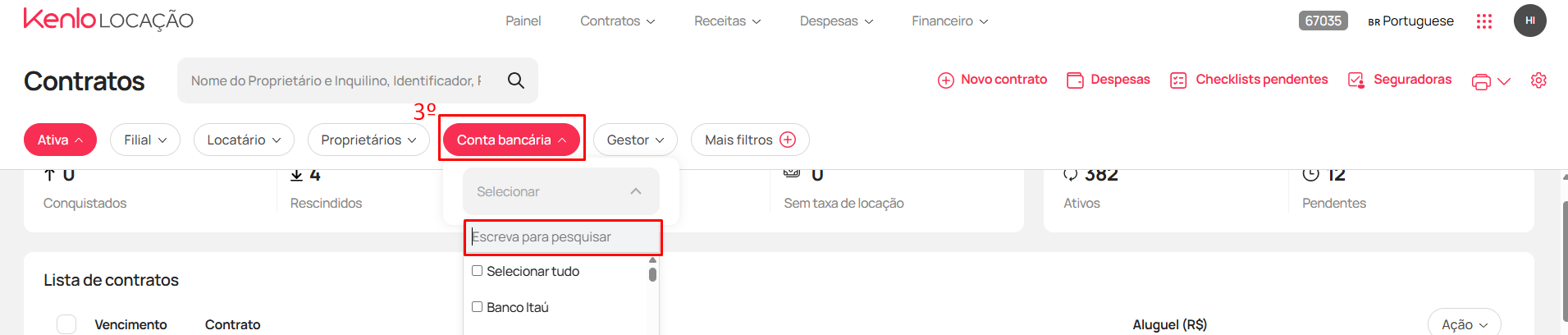 - Localize e clique no filtro "Conta bancária" e selecione a conta vinculada a forma de recebimento