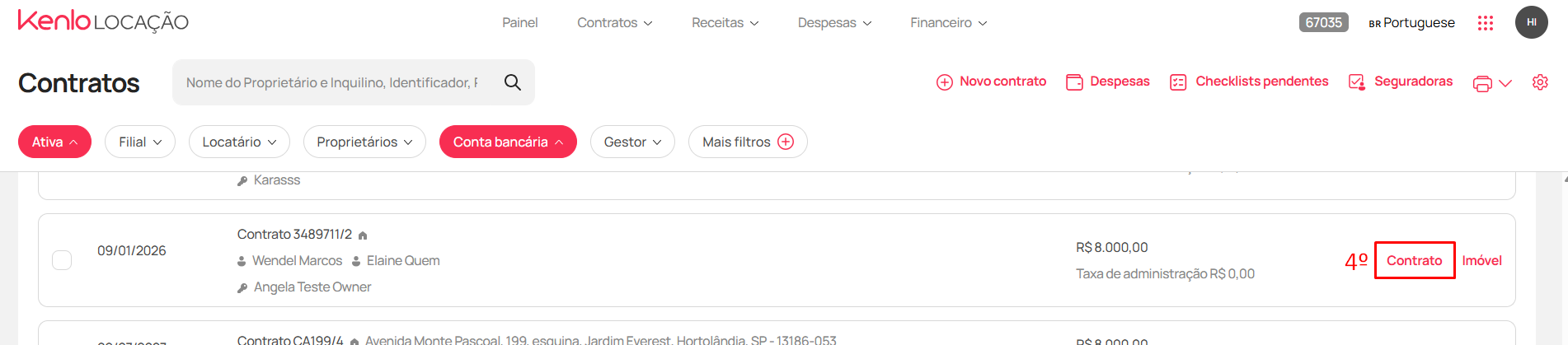 - Após, irá abrir uma lista com todos os contratos vinculados a esta conta, para alterar clique em "Contrato",ao lado direito direito (4)