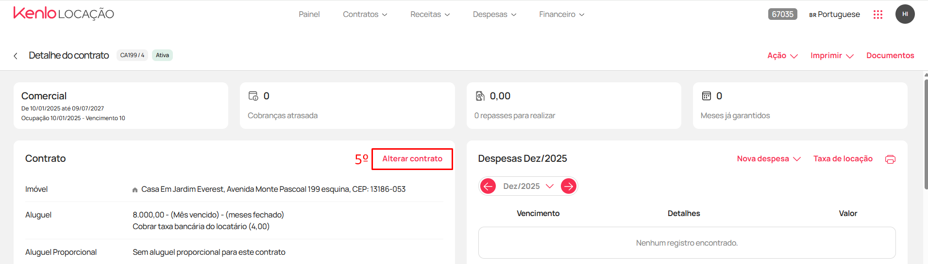 - Na tela "Detalhe do contrato" ao lado esquerdo, clique em "Alterar contrato" (5)