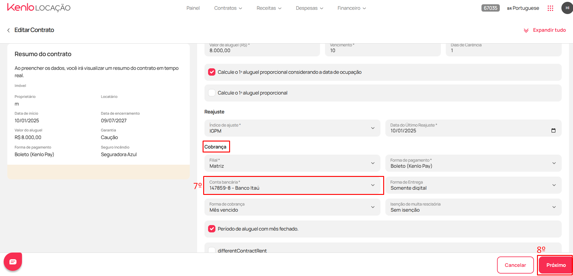 - Encontre o campo "Cobrança" > "Conta bancária" e altere a conta para nova forma de recebimento (7) e clique em "Próximo" (8)