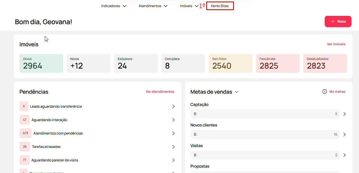 - Faça login na plataforma Kenlo Imob com suas credenciais e no canto direito da tela clique em "Kenlo Sites (1)"