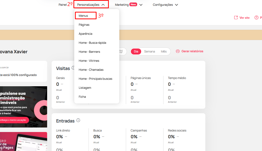 - No menu do Kenlo Sites, clique em “Personalizações (2)” e escolha a opção de “Menus (3)”