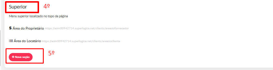 - No quadro “Superior (4)” clique em “Nova seção (5)”