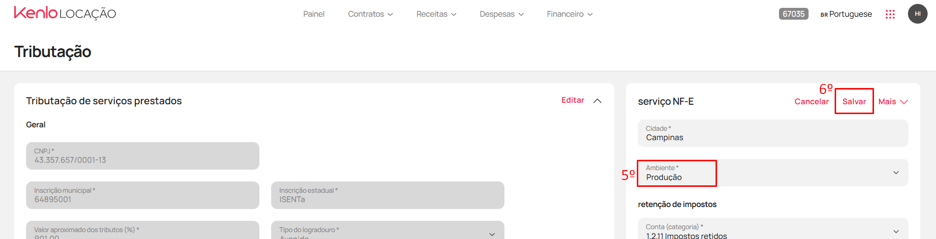 - No campo "Ambiente", selecione a opção "Produção" (5) e clique em "Salvar" (6)