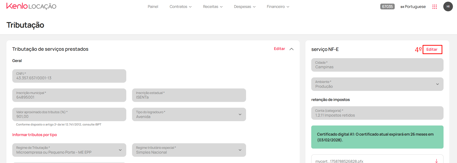 - Ao lado direito da tela em "Serviço NF-E", clique em "Editar" (4)