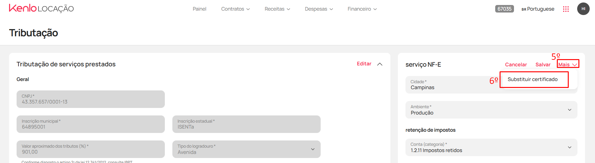 - Em seguida, clique em "Mais" (5) > "Substituir certificado"(6). Selecione o arquivo do novo certificado, que deve estar salvo em seu computador