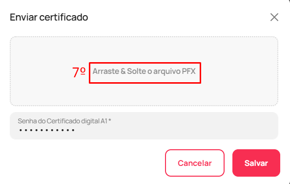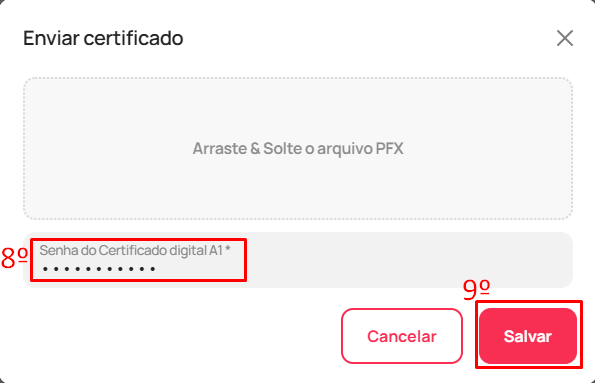 - Registre a senha (8) do certificado e clique em "Salvar" (8)
