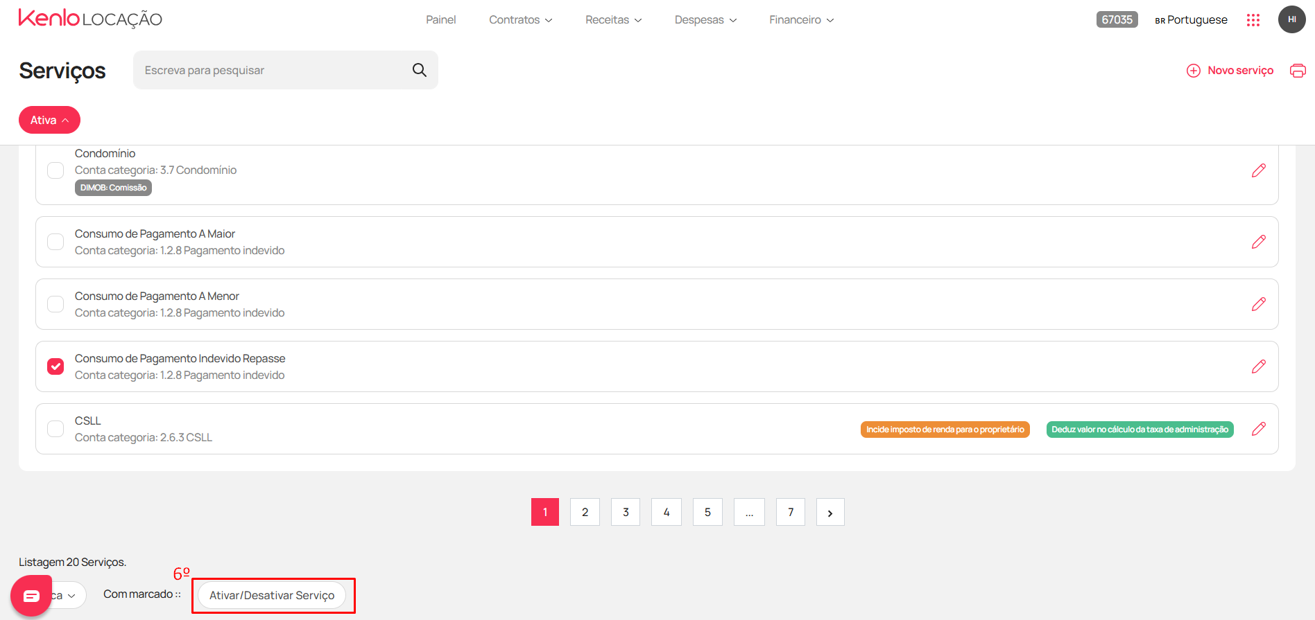 - Após selecionar, desça até o final da página e clique no botão "Ativar/Desativar Serviço" (6)