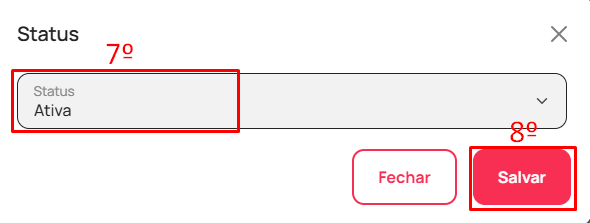 - Na seção de "Status", selecione a opção "Ativa" (7) e clique em "Salvar" (8)