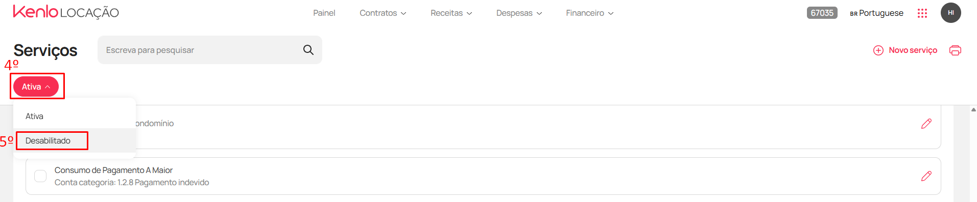 - Na tela de "Serviços", clique no filtro "Status" (4) > "Desabilitado" (5)