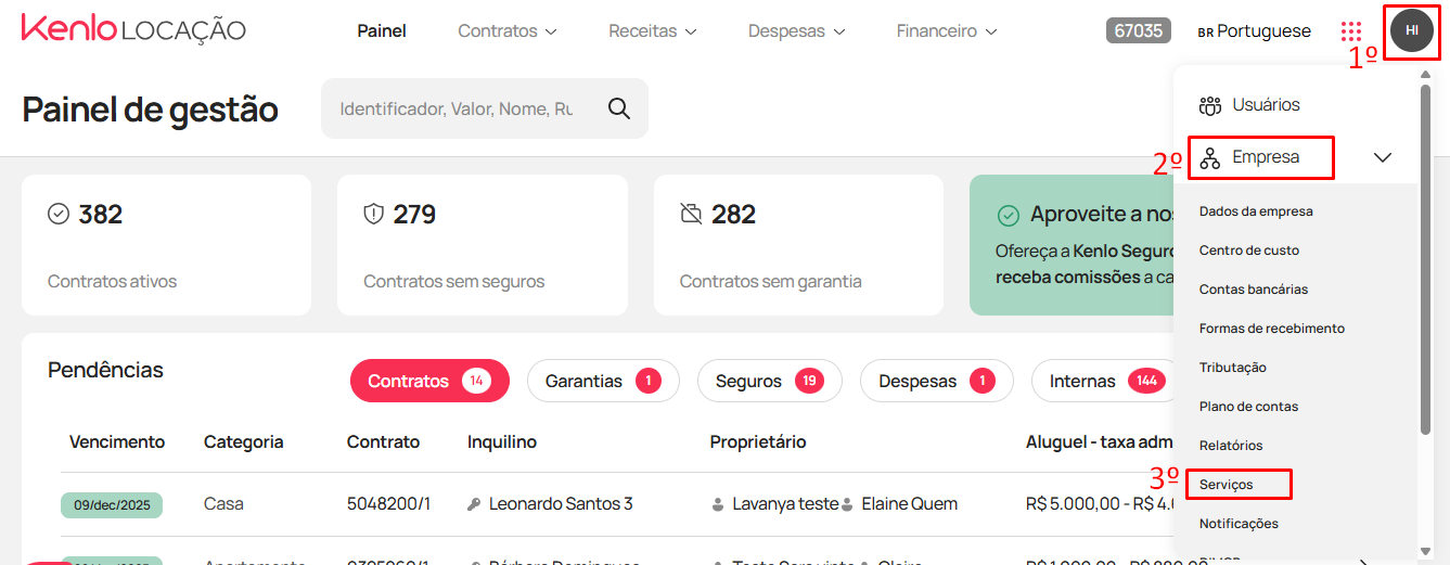 - Ao abrir o menu, clique em "Empresa" (2) > "Serviços" (3)