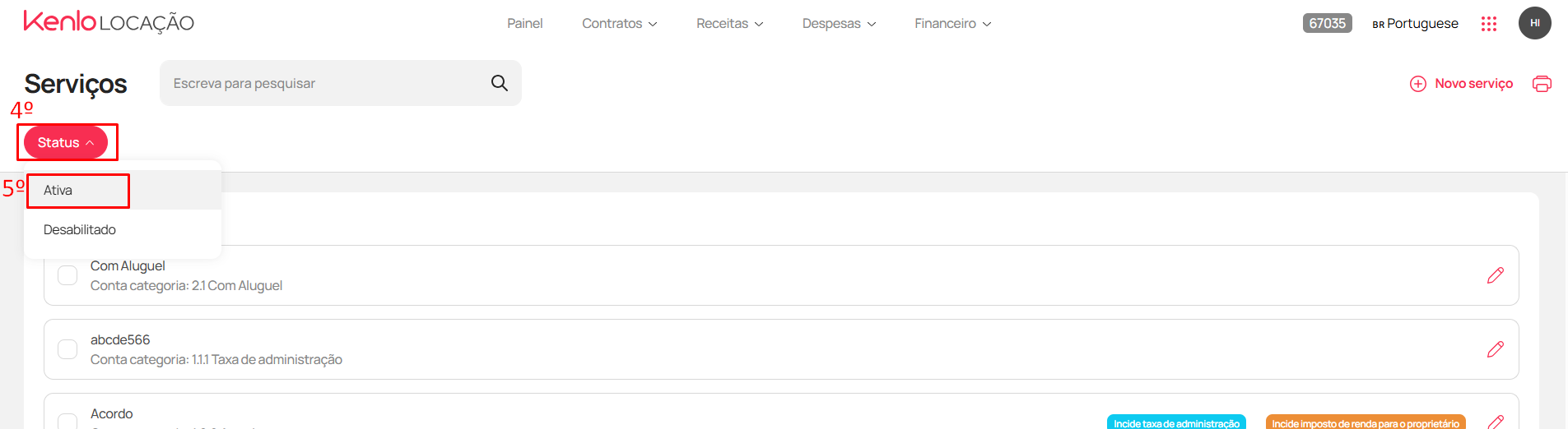 - Na tela de "Serviços", clique no filtro "Status" (4) > "Ativa" (5)