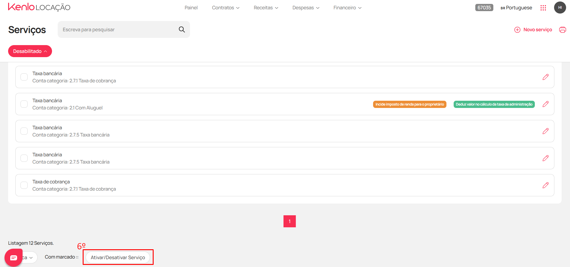 - Após selecionar, desça até o final da página e clique no botão "Ativar/Desativar Serviço" (6)