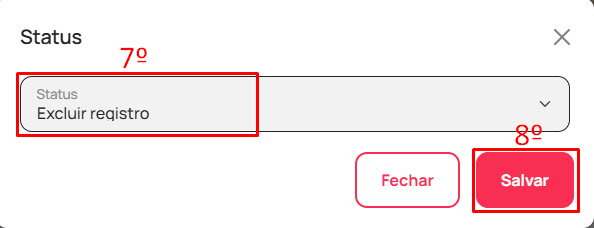 - Na seção de "Status", selecione a opção "Excluir registro" (7) e clique em "Salvar" (8)