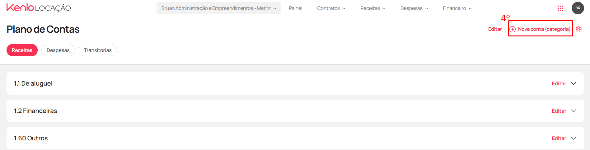 - Na tela "Plano de Contas", ao lado direito, clique em "Nova conta (categoria)" (4)