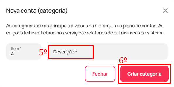 - Preencha o nome da categoria no campo "Descrição" (5) e clique em "Criar categoria" (6)