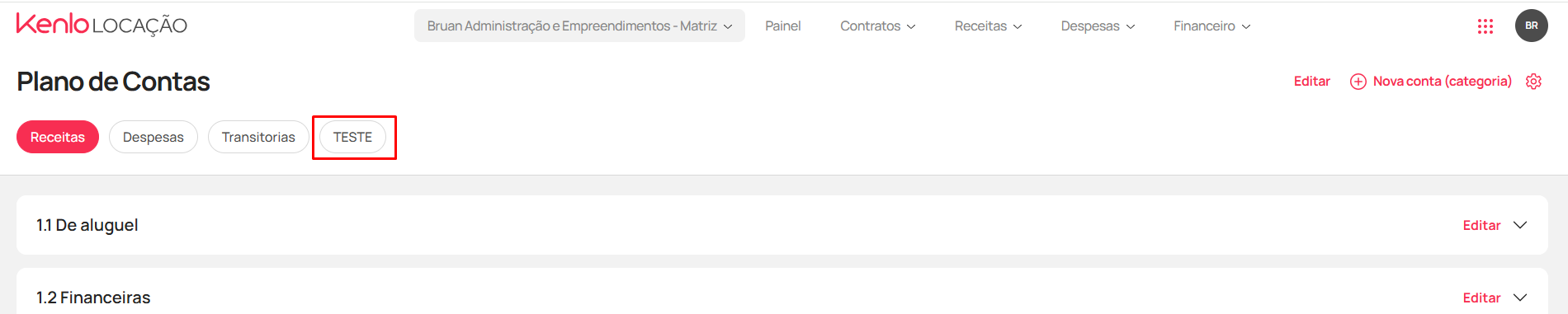 - Após criar a categoria ela ira aparecer na tela "Plano de Contas"