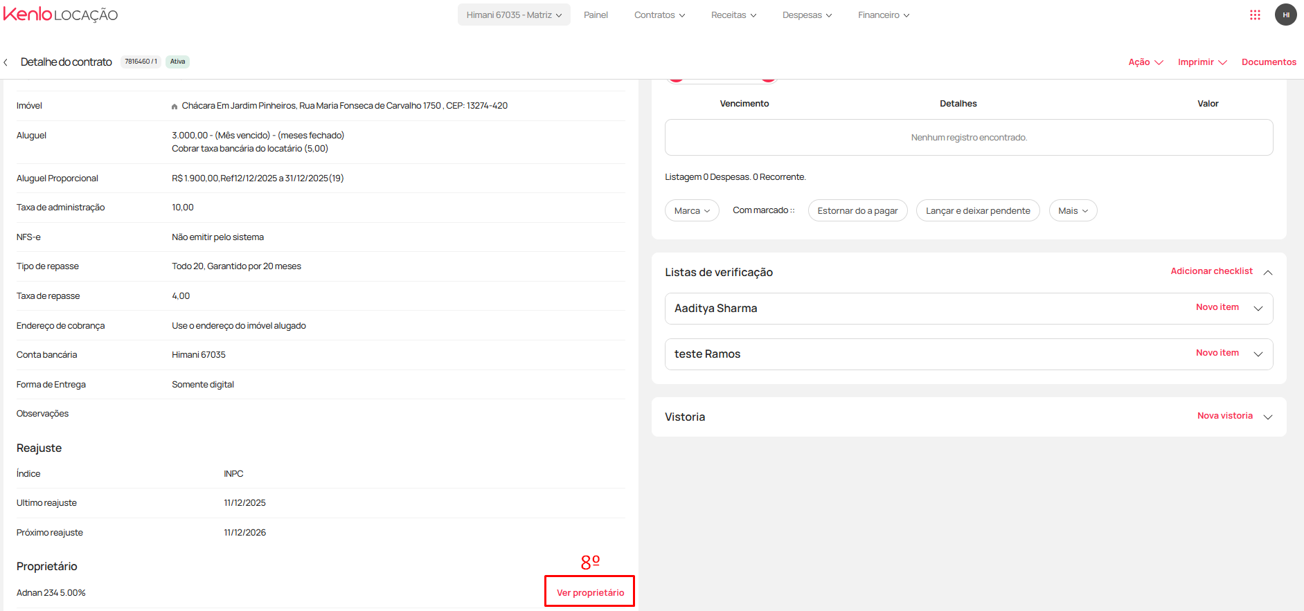 - Retorne a tela de "detalhe do contrato" e entre no cadastro do proprietário, clicando em "Ver proprietário" (8)