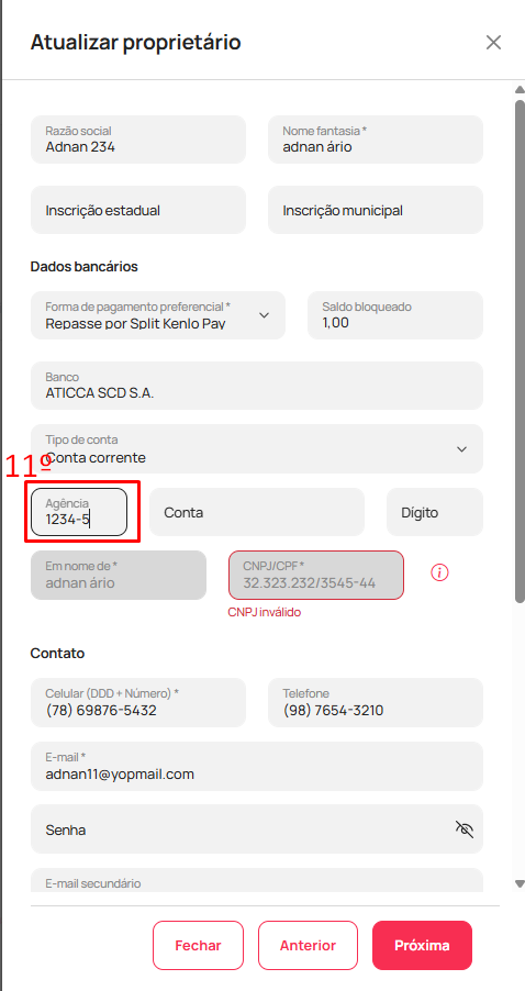 - Valide se no campo "agência" os números da agência estão corretos. Lembrando que, se a agência possuir números e dígito informar no formato "0000-0", ou seja, números da agência, hífen e dígito (11). Como no exemplo abaixo: