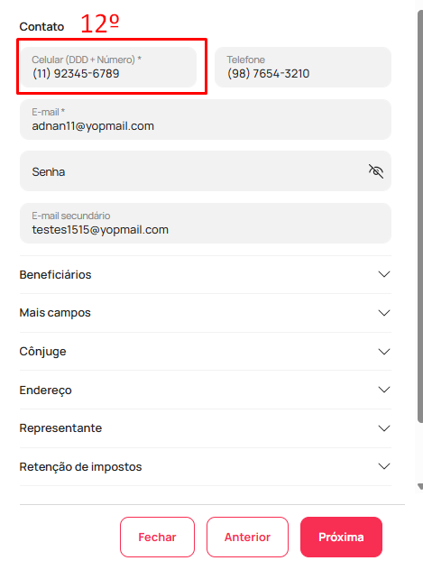 - Valide se na parte de "contato" o número de telefone informado, segue o padrão "(00) 92345-6789". Como no exemplo abaixo (12)