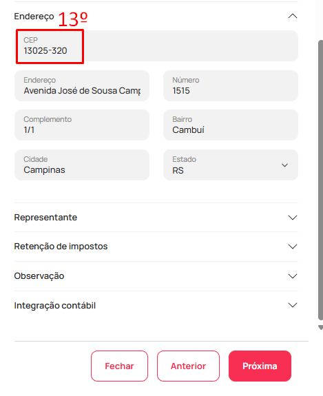 - Após, siga até o item "Endereço", valide se o CEP está no formato "00000-000" (13). Como no exemplo abaixo: