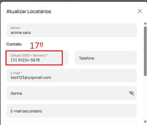 - Valide se na parte de "contato" o número de telefone informado, segue o padrão "(00) 92345-6789". Como no exemplo abaixo (17)