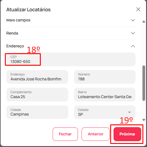 - Após, siga até o item "Endereço", valide se o CEP está no formato "00000-000" (18). Após, clique em "Salvar" (19)