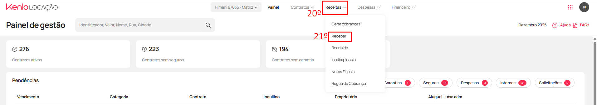 - Após realizar todas estas validações, no menu clique "Receitas" (20) > "Receber" (21)