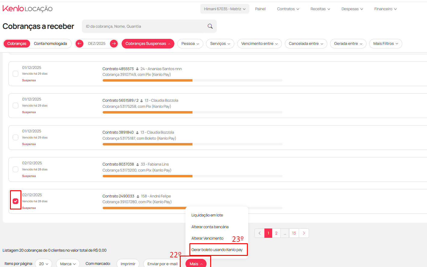 - Após, selecione a cobrança, desça até o final da página e clique em "mais" (22) e selecione a opção "Gerar boleto usando o Kenlo Pay" (23)